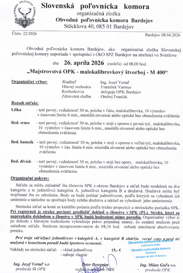 Obvodná poľovnícka komora Bardejov v spolupráci Okresnou organizáciou Slovenského poľovníckeho zväzu v Bardejove už tradične organizuje pre svojich členov strelecké podujatie - Majstrovstvá okresu v streľbe z malokalibrovky – RM 400.